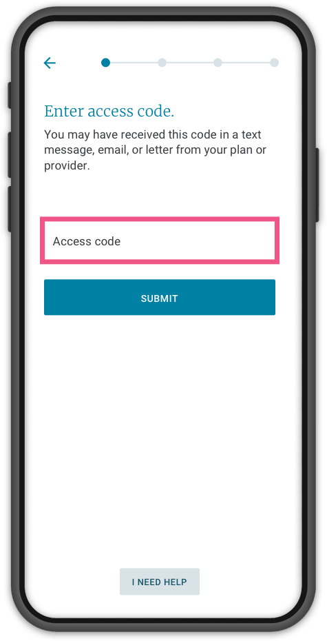 Enter the access code from your health plan. This is the special code you received from your health plan or healthcare provider in a phone call, email, text message, letter, or brochure.