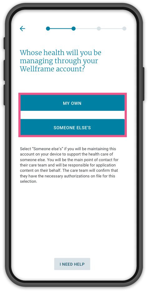 If you will be using the app to support your own health, click on “My Own”. If you will be using the app to support someone in your care (like a child or other adult), click on “Someone Else’s”.