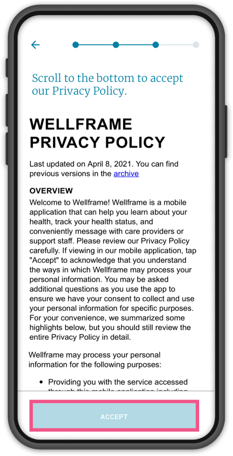 Because privacy is important to us, please read through our privacy policy. When you’ve reached the bottom of the page, click on “Accept”.