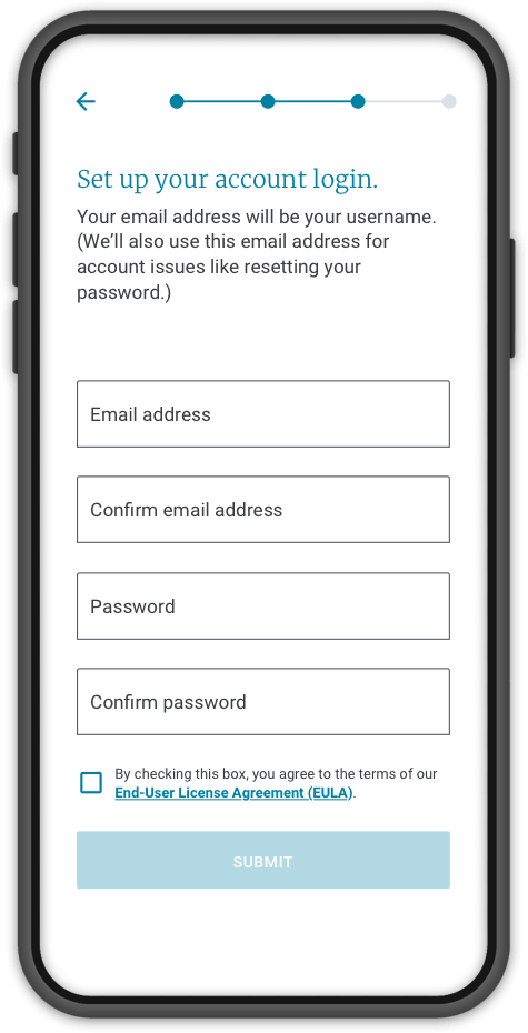 This email address will serve as your username when you log in to the app. Create a password with 8 characters, including at least 1 letter, 1 number, and 1 special character such as #!$%%^@?