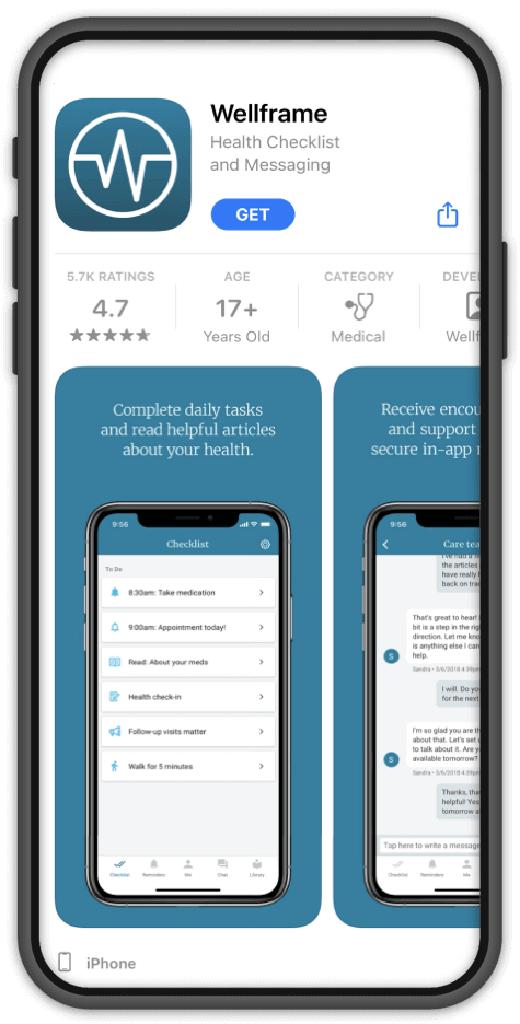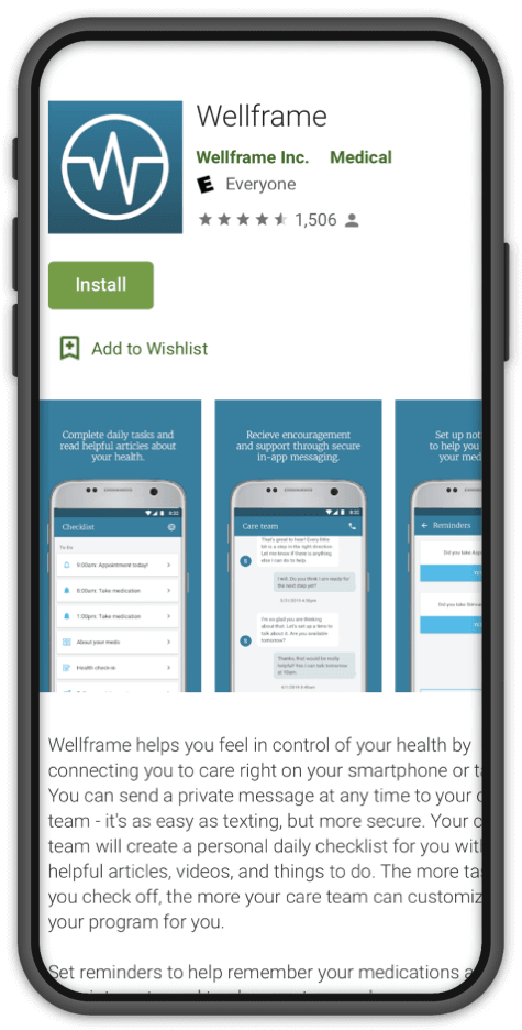 Mark sure you have your tablet or smartphone so you can download and install the Wellframe app from either the Apple App Store or Google Play Store.