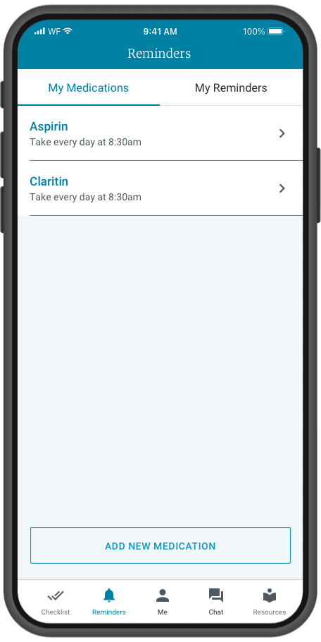 Click on “Reminders” to add a medication reminder and help you keep track of your routine.
