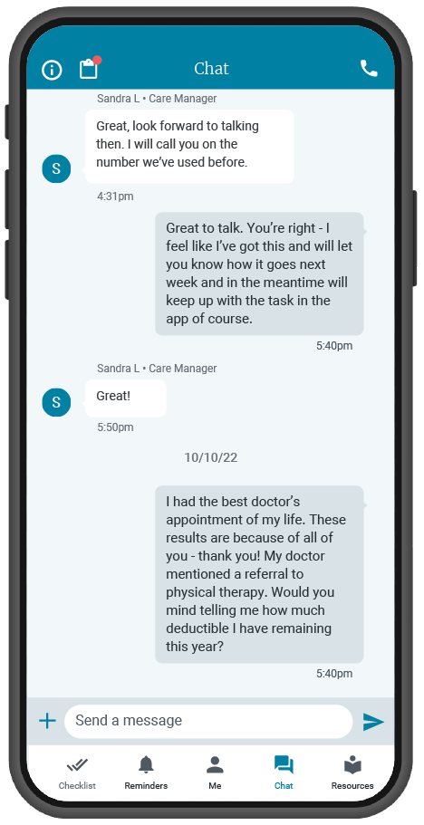 Tap the “Chat” icon to securely message your care team. You can ask them questions about your health and benefits on your own time.