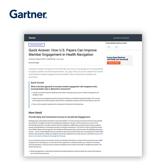 Gartner, Quick Answer: How U.S. Payers Can Improve Member Engagement in Health Navigation, Connie Salgy, 13 March 2023. GARTNER is a registered trademark and service mark of Gartner, Inc. and/or its affiliates in the U.S. and internationally and is used herein with permission. All rights reserved. Gartner does not endorse any vendor, product or service depicted in its research publications, and does not advise technology users to select only those vendors with the highest ratings or other designation. Gartner research publications consist of the opinions of Gartner’s research organization and should not be construed as statements of fact. Gartner disclaims all warranties, expressed or implied, with respect to this research, including any warranties of merchantability or fitness for a particular purpose.