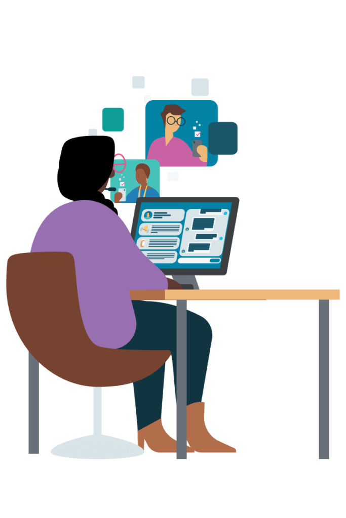 Illustration of a clinician and health plan staff sending interacting with a member through a digital screen, representing a member resource center.